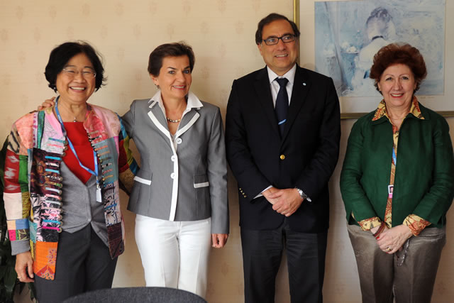 Bernarditas Muller, head negotiator for Phillipines; Christiana Figueres, UNFCCC Executive Secretary; Jorge Argüello, Ambassador of Argentina to the United Nations and Chairman of the Group of 77 and China: and Sivlia Merega, Head of the Delegation of Argentina. (PHOTO: Leila Mead/IISD)